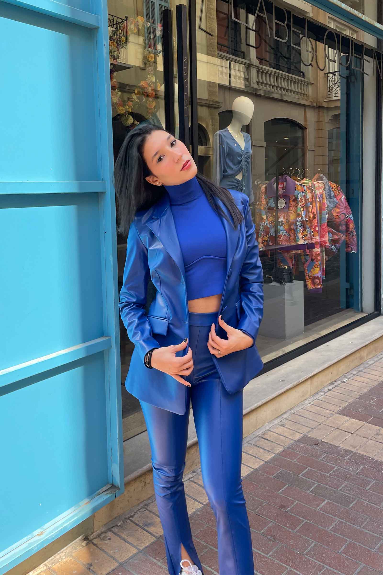 Transcend trends with this leather blazer that fits perfectly. Add a modern edge to your wardrobe and wear it from day to night, dressed up or down. You can definitely create infinite looks with this unique blue leather piece!