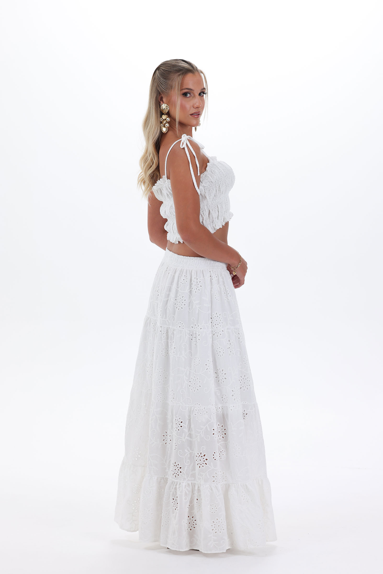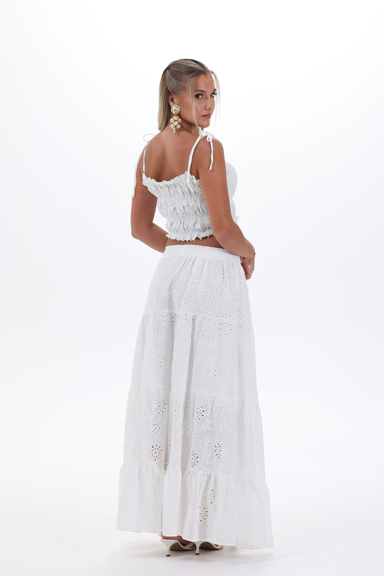 The Celine Set is bohemian beauty, elevated. The ruched top ties into soft bows at the shoulders, while the full-length 100% cotton skirt stuns with layered eyelet embroidery and a soft lining for comfort. Finished with an elasticated waistband, it blends luxury and ease, perfect for countryside getaways or coastal escapes.