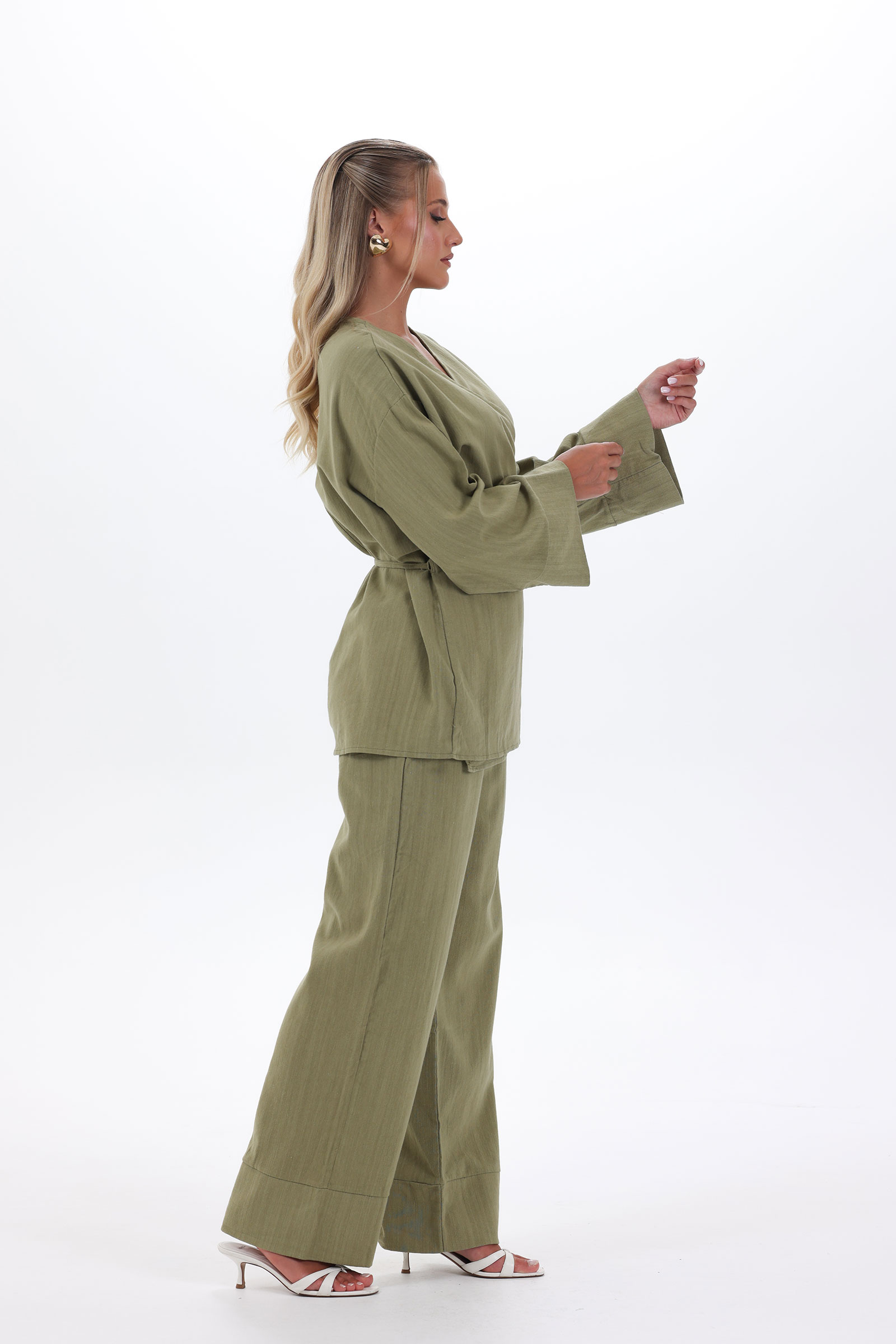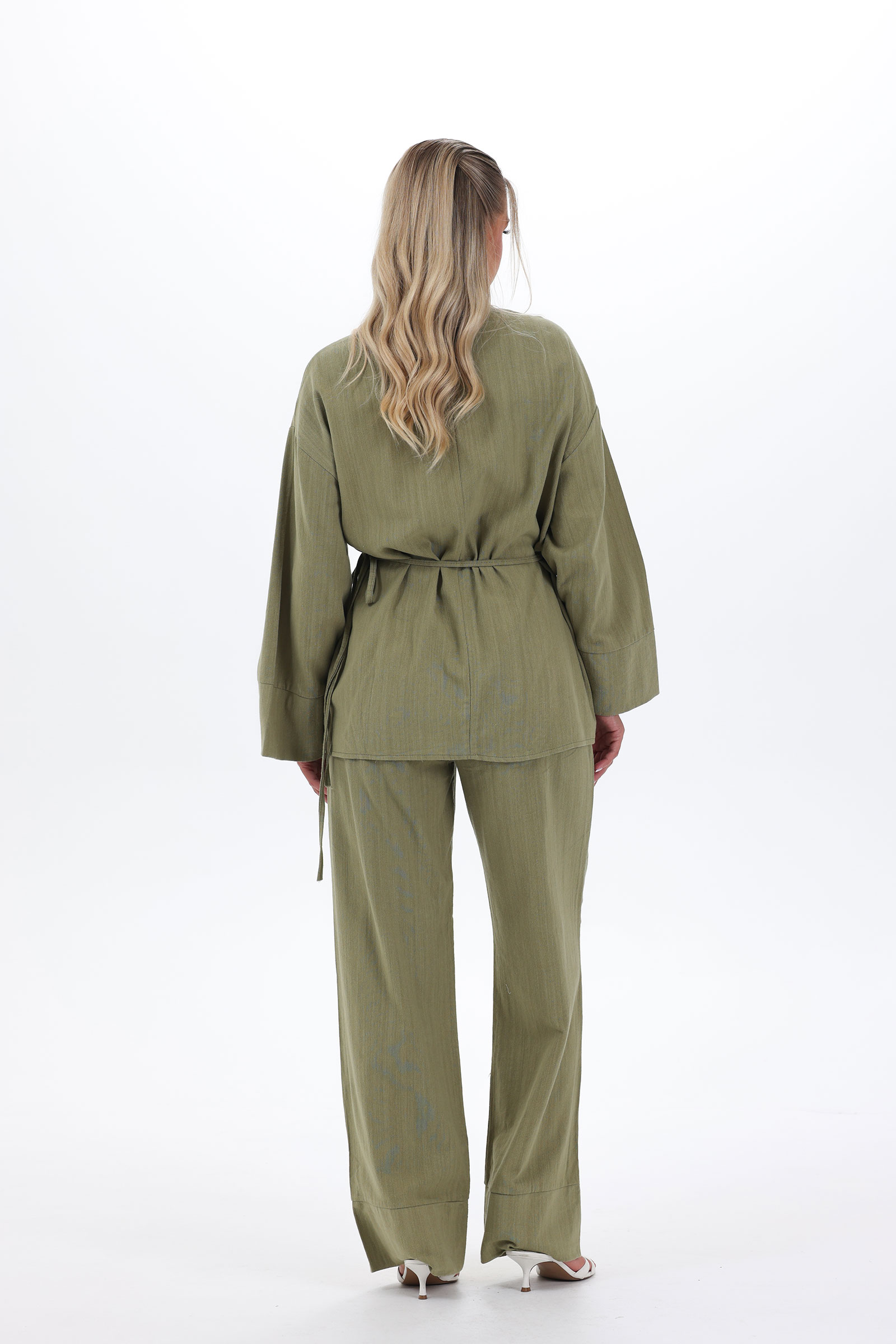 The Hana Set combines modest, structured, and comfortable all at once. The long kimono top, with wide sleeves, ties at the waist with inner drawstrings that slip through a hidden keyhole opening for a clean, adjustable fit. Paired with straight-leg pants with an elasticated waist, this full-length 100% cotton set brings graceful ease to every step. It’s ideal for laid-back lunches that still feel put-together.