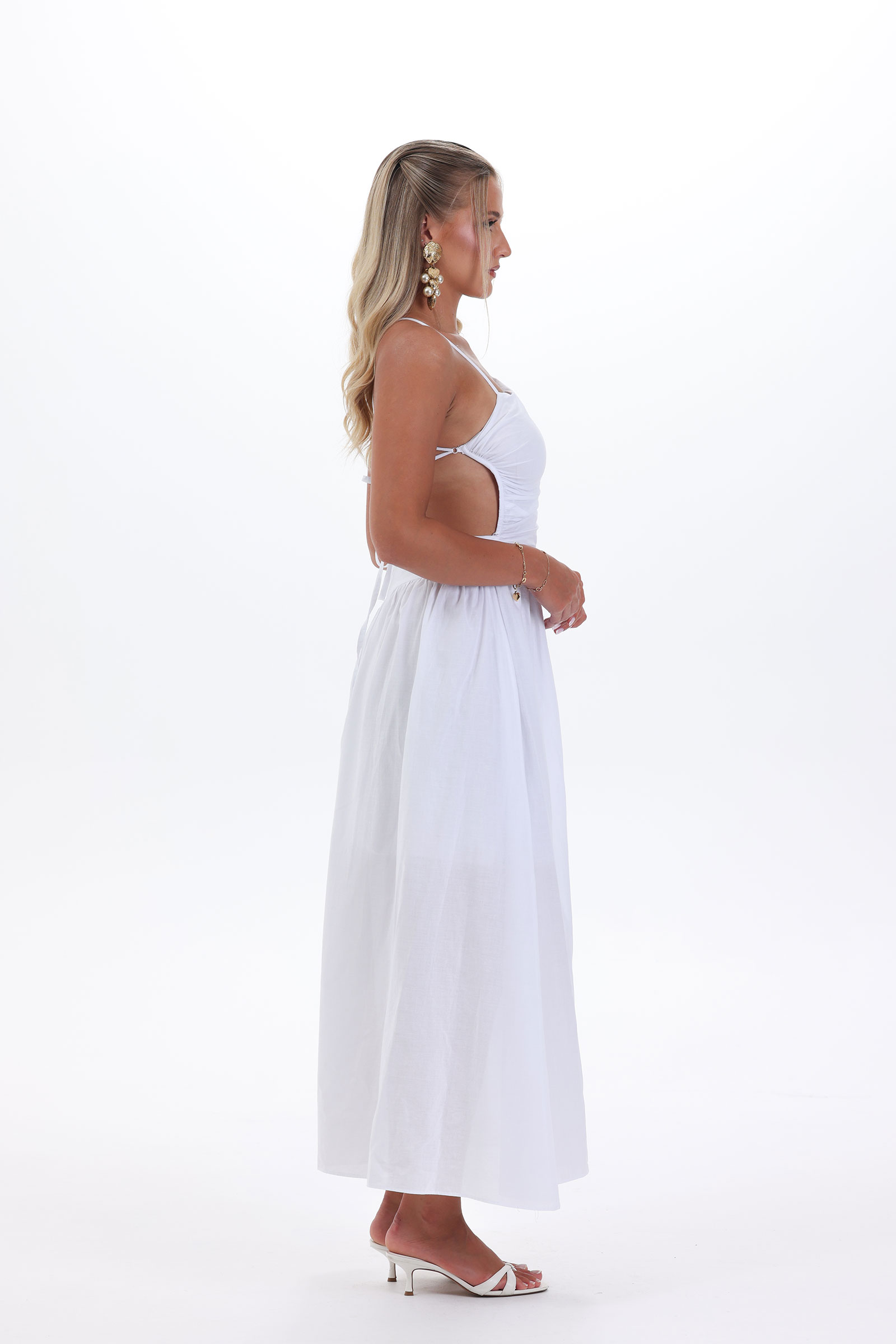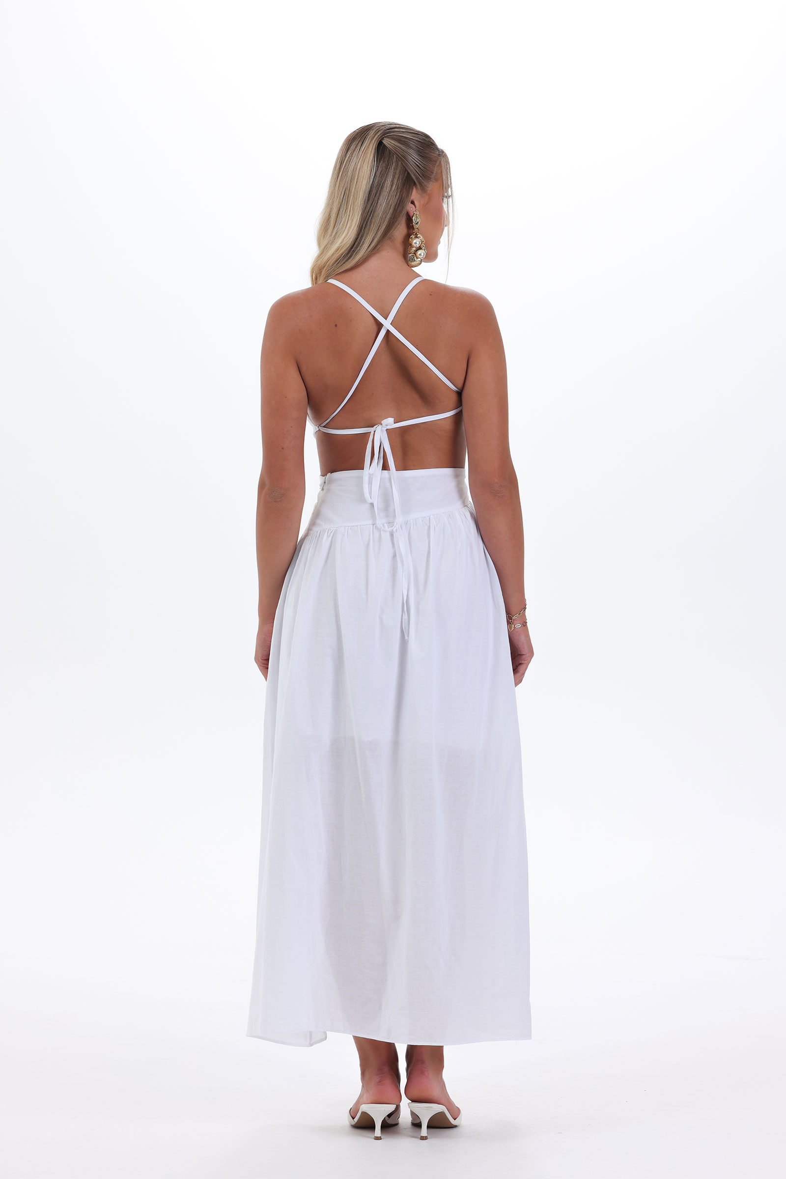 The Lyra Dress balances structure and softness with its artful asymmetry. The neckline sweeps diagonally into a gathered bodice, where one side ruches and the other cuts into a V-shaped opening. Crisscross straps frame the open back, while the asymmetric waist flows into a ruched, A-line skirt. Crafted from airy light fabric, it’s geometric yet romantic, perfect for days when elegance meets edge.